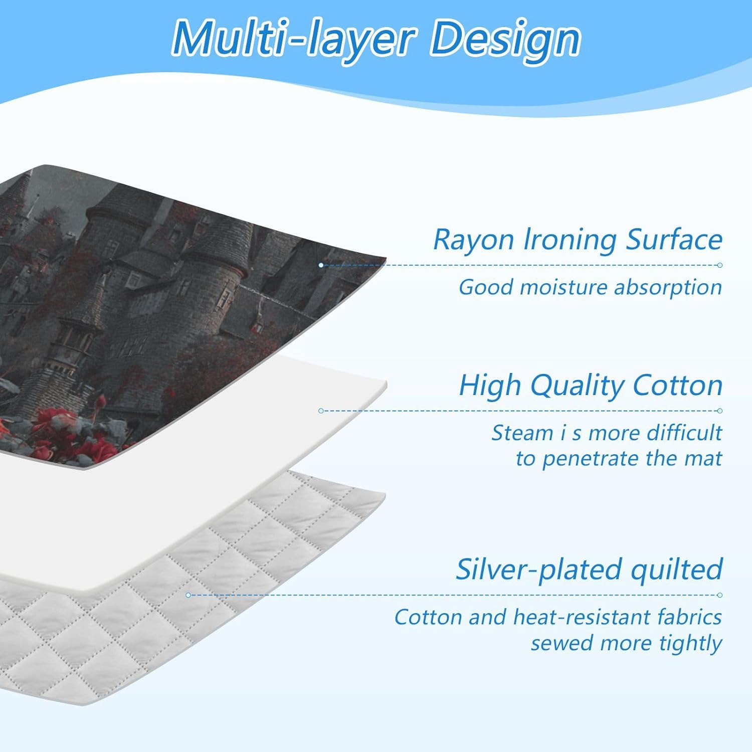 - High Quality:This ironing mat adopts a multi-layer design, with a surface made of Rayon lroning and good moisture absorption. High quality cotton in the middle makes it Steam more difficultto penetrate the mat. The bottom layer is coated with 210 silver-plated quilted, with cotton and heat-resistant fabricssewed more tightly. The ironing pad can be used on both sides, making it more durable