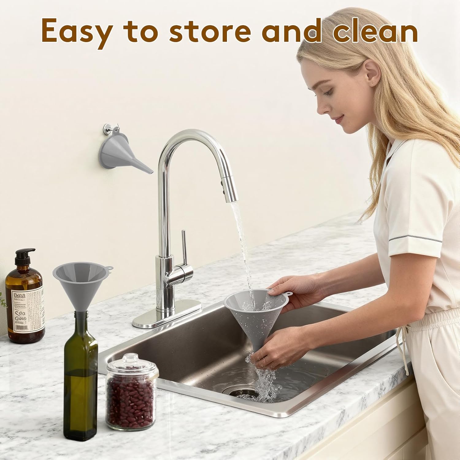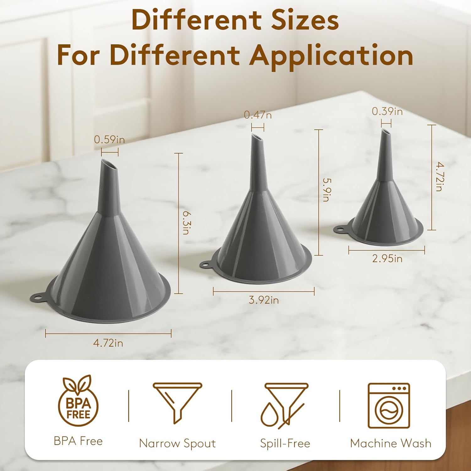 - 【3-Piece Funnel Set】:You will get 3 different sizes of funnel ,mini:4.7'' *2.9''; medium 5.9'' * 3.9''; large 6.3''*4.7''.From spice jar to salad oil bottle, always the right fit.