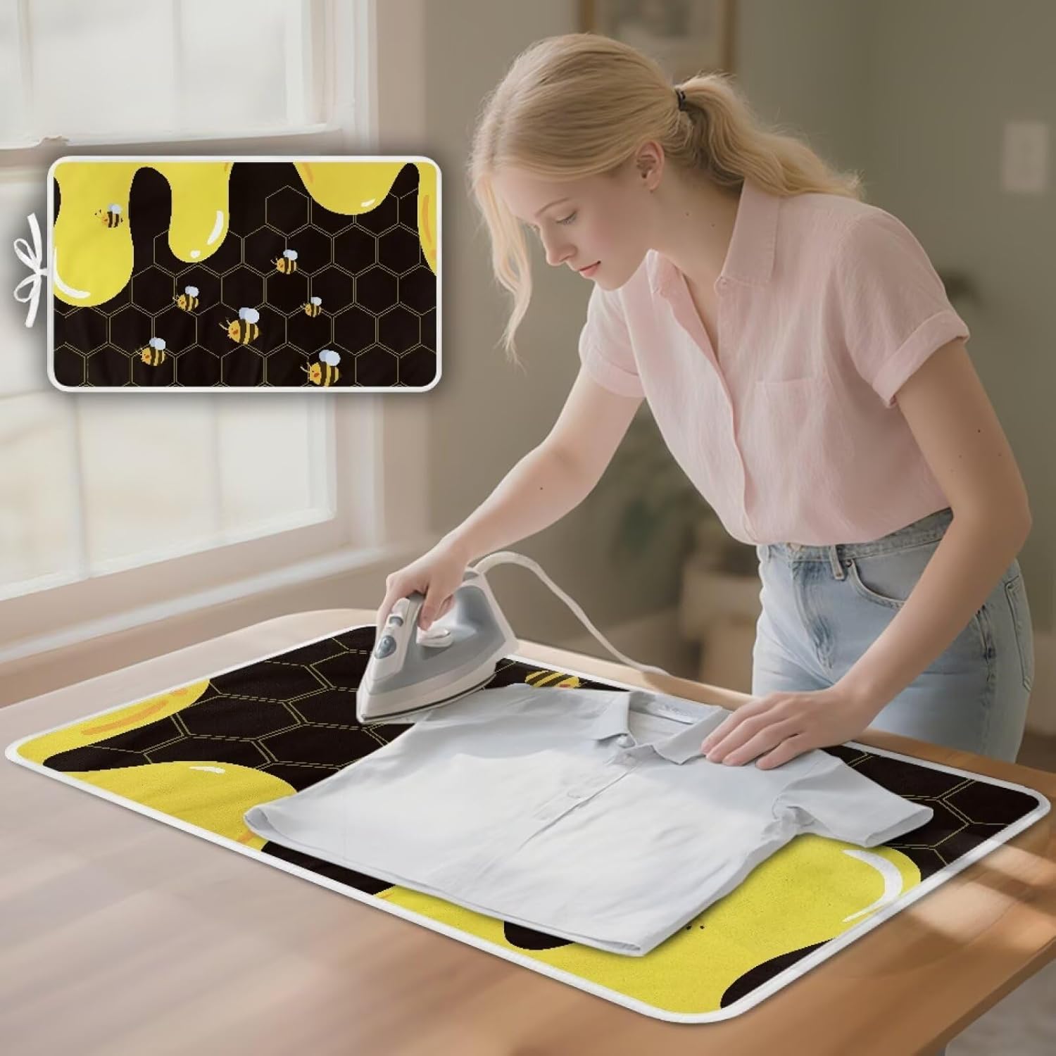 Cute Ironing Mat for Table top Washer,Dryer,Countertop,Bee Portable Iron Pad Blanket for Washer Dryer Countertop Travel 32 x 16 Inch Small Ironing Pads,Yellow