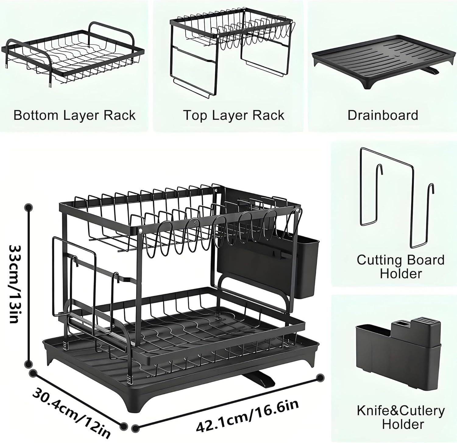 Dish Drying Rack-Dish Rack for Kitchen Counter, 2-Tier Kitchen Organizers and Storage Rack with Drainboard and Cutlery Holder, Large 1 Pack Carbon Steel