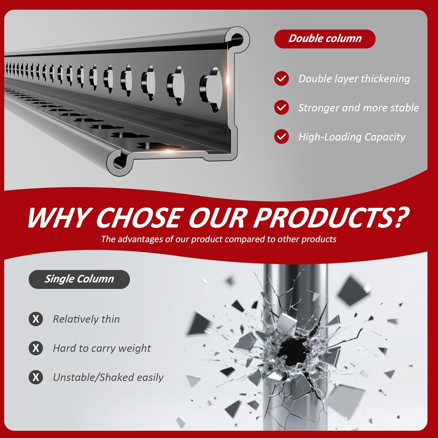 - 【Adjustable Metal Shelving】The metal shelving can be adjusted according to your needs.You are free to adjust the metal shelf, not only adjustable by moving the crossbar up or down to meet the different heights of varied objects needed, but also divided one shelf into two individual shelves, it is a great choice for garage organization and storage