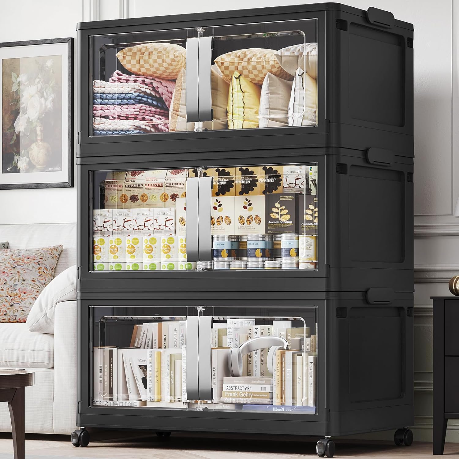 - 【Super Clear Doors & Ease Access】Stackable storage bins with doors open front features super clear PET doors for instant content viewing at a glance. Enjoy effortless one-handed access with the oversized ergonomic handle and secure magnetic closure. Sleek and modern folding storage bins with lids seamlessly complements any contemporary home decor