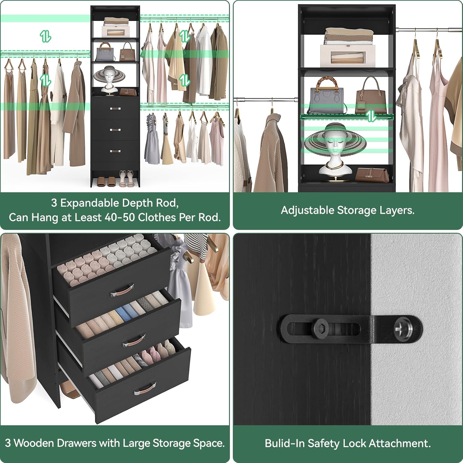 96'' Closet Organizer System with 3 Hanging Rods (Without 3 Storage Shelves), 8FT Closet Systems, Wall Mount Bedroom Wardrobe with 3 Wood Drawers, Adjustable Garment Rack from 5 to 8FT, Black