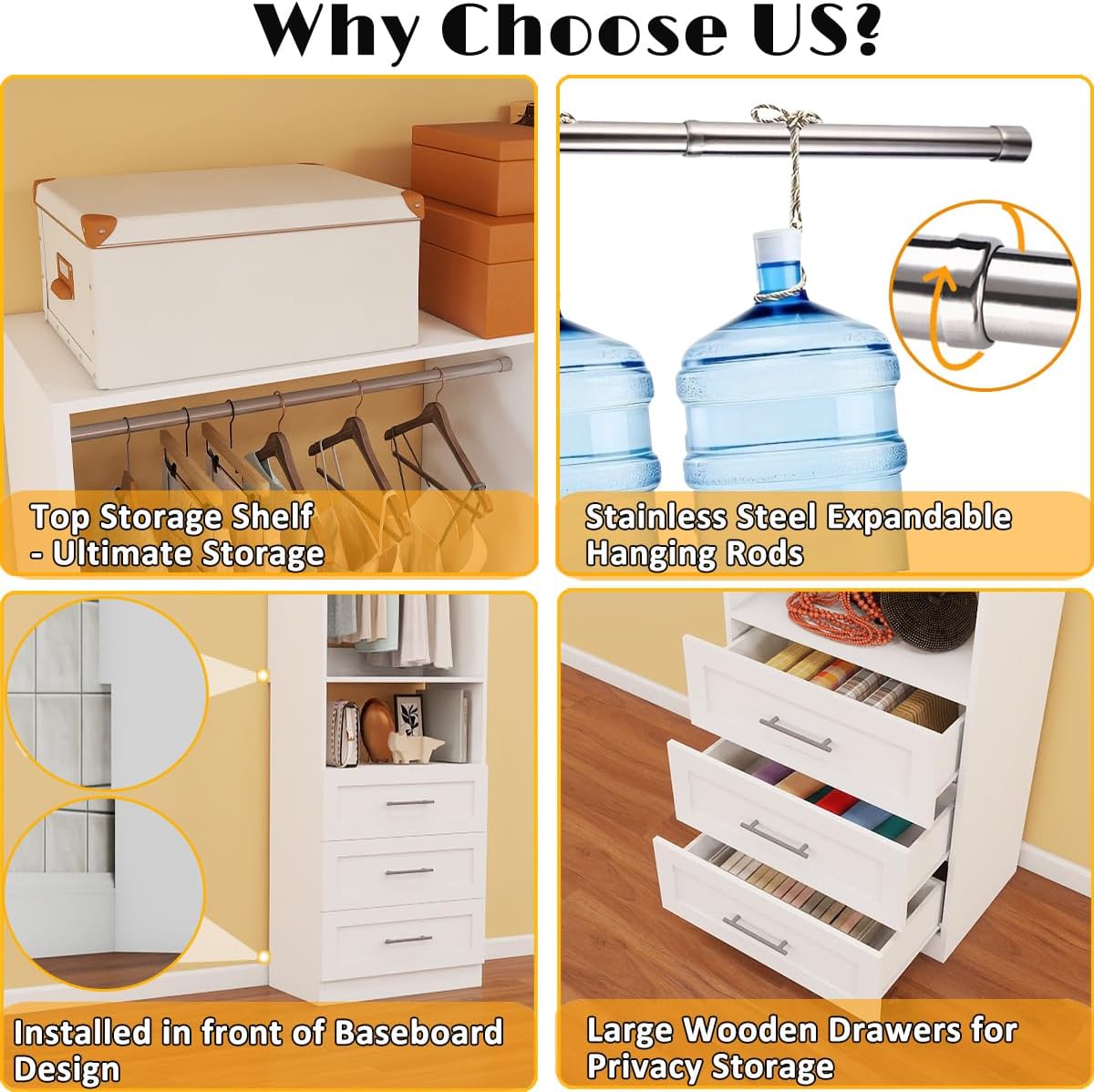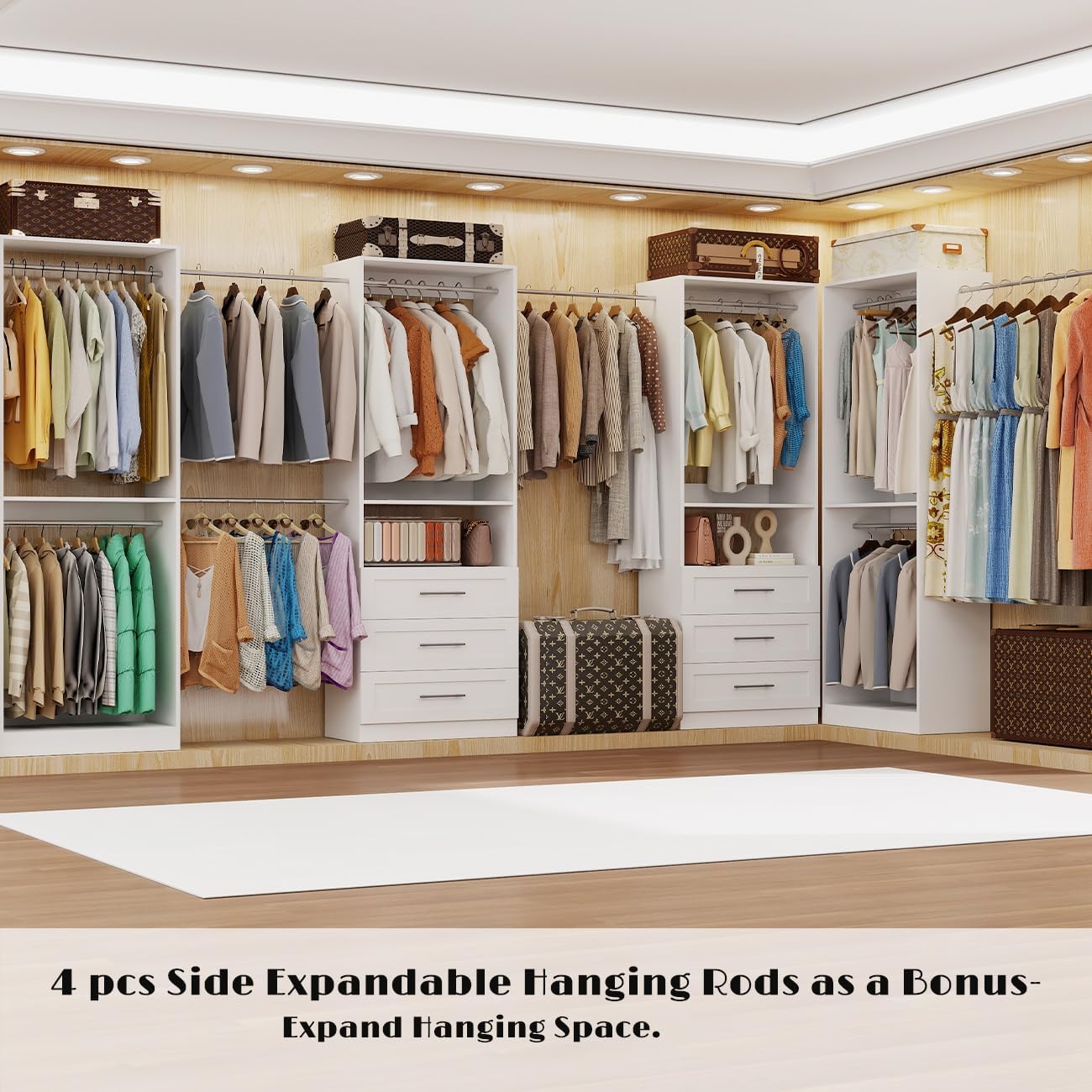 - 【4-in-1 Modular Closet System — Customize Your Way】This system includes 4 independent closet units, featuring 6 spacious wooden drawers and 10 sturdy hanging rods in total. You can freely arrange them into a long straight layout, an L-shape, or even a U-shape to perfectly fit your walk-in closet. Enough Hanging space keeps your garments wrinkle-free, helps maintain their shape, and makes it easy to see and choose what to wear at a glance. This closet organizer system keeps your walk-in closet neat, organized, and ready every day.