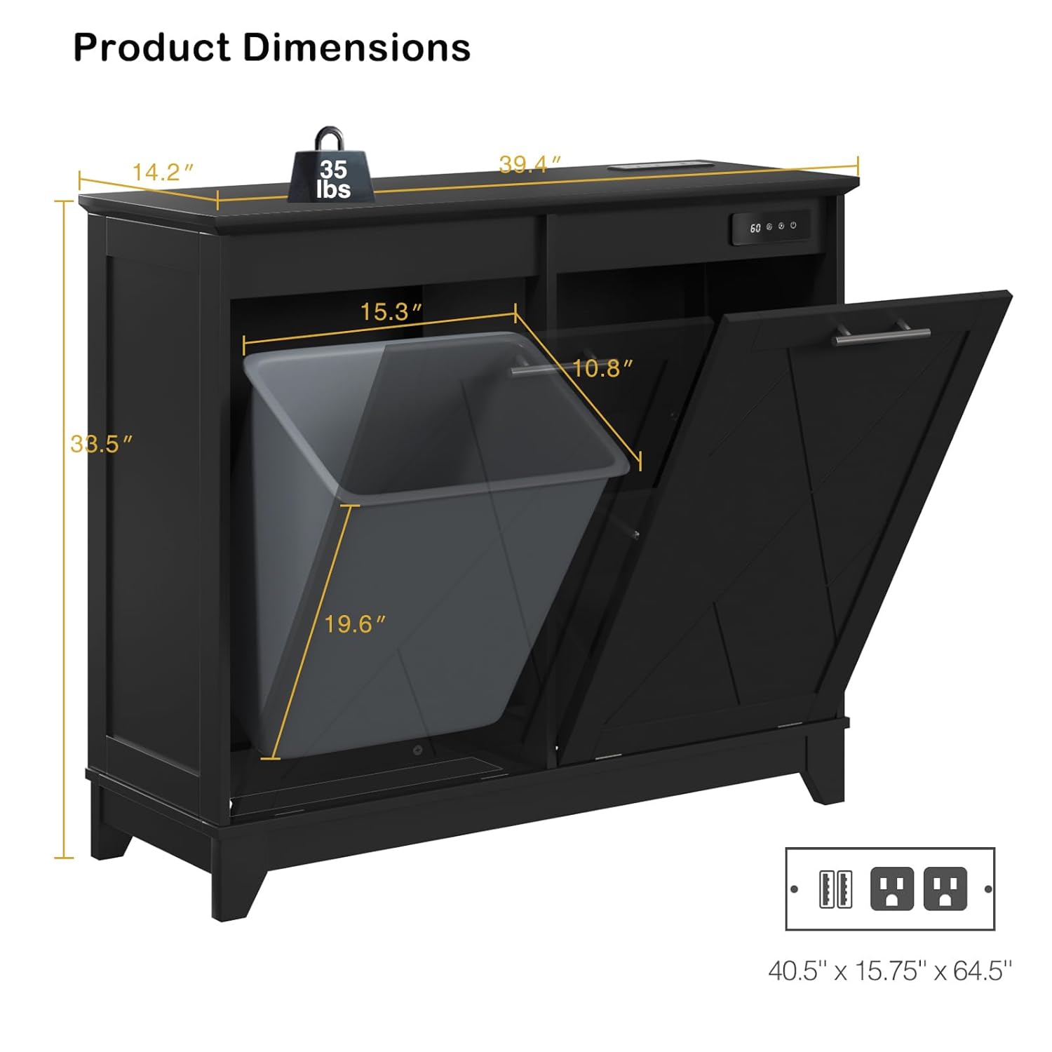 Double Tilt Out Trash Can Cabinet, 10 * 2 Gallon Garbage Trash Bin with Charging Station and Deodorizing Function, Dog-Proof Storage Cabinet for Hidden Bathroom Laundry Hamper, Black