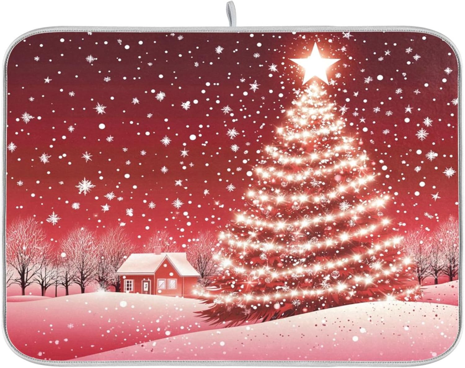 Christmas Tree Red Dish Drying Mat for Kitchen Countertop 18x24 Winter Snow Cabin Xmas Large Drying Mat Reusable Quick Dry Dish Sink Mats Easy Clean Decorative Essentials
