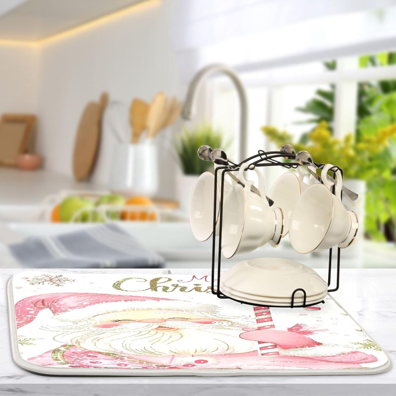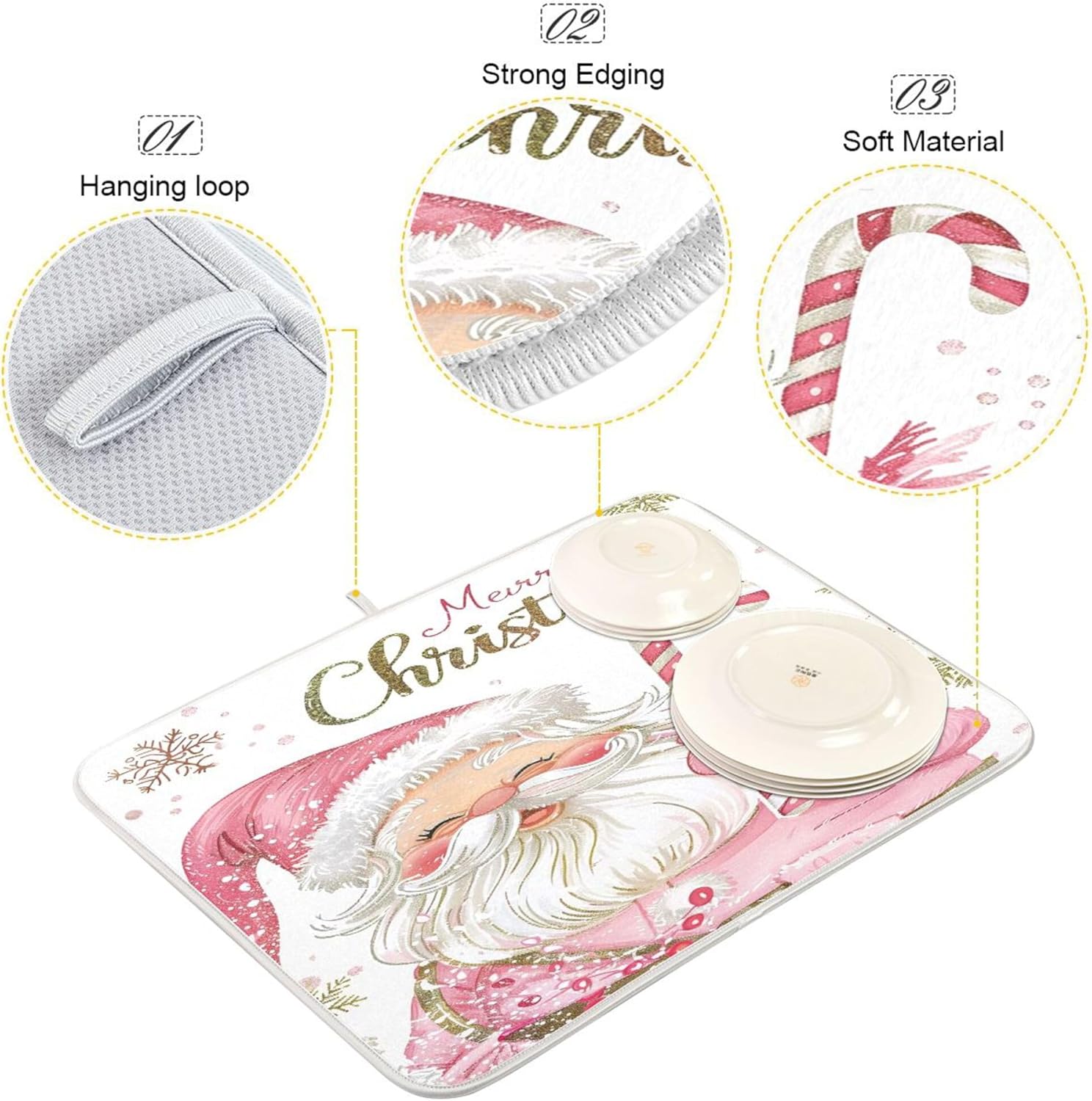 Christmas Santa Claus Pink Dish Drying Mat for Kitchen Countertop 16x18 Xmas Candy Cane Snowflake Small Drying Mat Reusable Quick Dry Dish Sink Mats Easy Clean Decorative Essentials