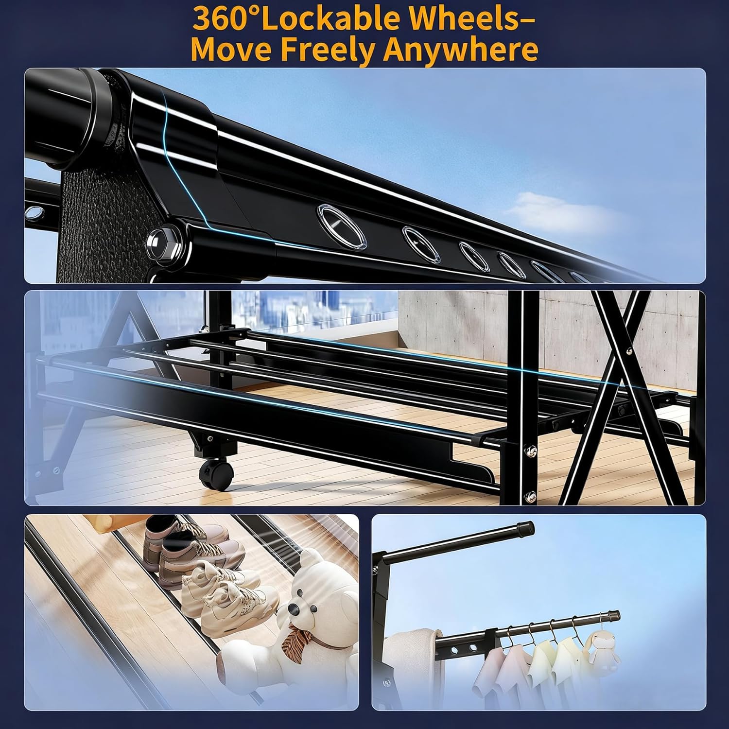 - 360°Lockable Wheels for Easy Mobility – Equipped with smooth-rolling, lockable swivel wheels that move freely in any direction. Allows effortless repositioning of the rack across different floor types, while the lock function keeps it securely in place when stationary.